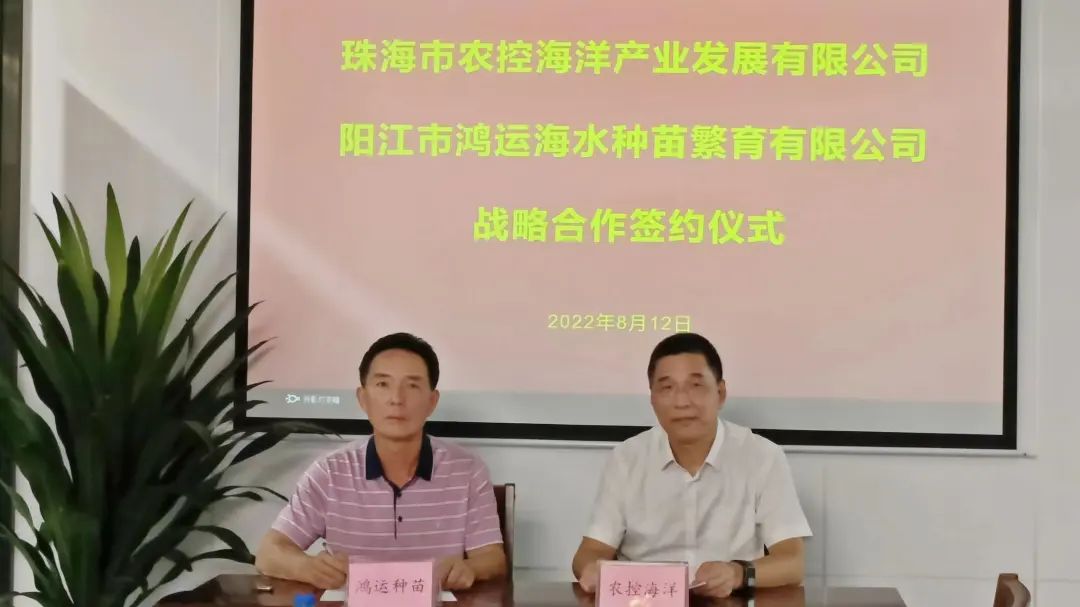 为进一步推进珠海农控智慧海洋牧场综合产业项目建设工作,2022年8月12日,农控海洋公司与阳江市鸿运海水种苗繁育有限公司(以下简称“阳江鸿运公司”)在木瓜视频 会议室举行战略合作签约仪式。双方代表签订了战略合作协议。
